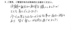 父の傘寿祝いのプレゼントに利用致しました。80年前の新聞紙面の写しはもちろん貴重ですが、プレゼント用にパウチや立派な台紙、印字も追加できて大変満足しております。このたびはお世話になり、ありがとうございました。