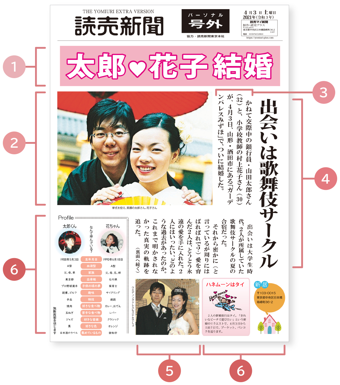 読売グループならではの新聞制作のプロ集団がサポートします。ベテランのライターやデザイナーが紙面を作成。表面にお二人のお写真を大きく掲載します。