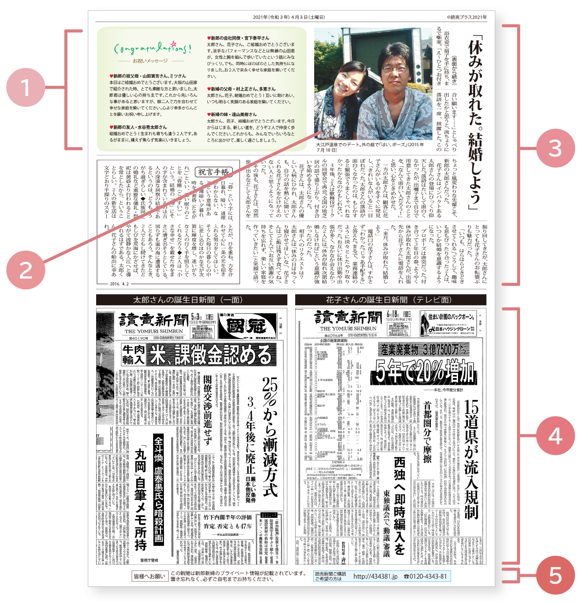 記事の裏面には、新郎新婦の誕生日の読売新聞1面やラジオ・テレビ面などを掲載します。おふたりが生まれたその日、世の中では何が起きていたのかがひと目でわかり、色あせない思い出が蘇ります。